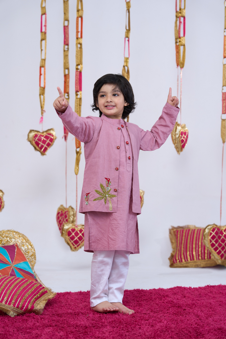 Bring playful charm and traditional elegance to your little one’s wardrobe with this Hand-Embroidered Jungle Motif Bandi Set for boys. Featuring intricate hand embroidery with vibrant jungle-themed motifs, this set beautifully combines creativity with cultural style. Crafted from soft, breathable fabric, it ensures all-day comfort while keeping him stylish. Perfect for festive occasions, family celebrations, weddings, and cultural events, this Bandi set is a delightful blend of tradition and fun.