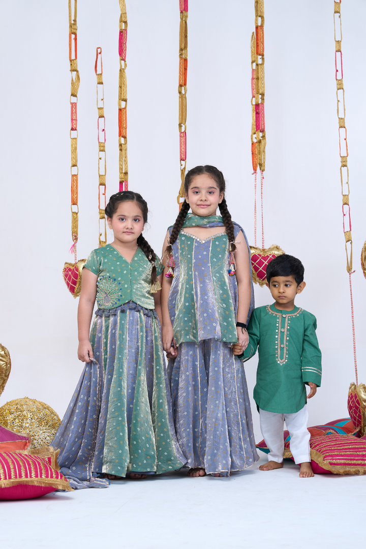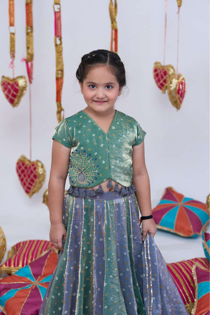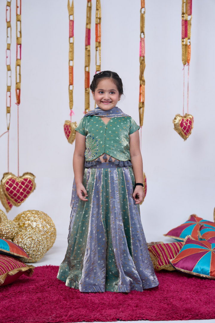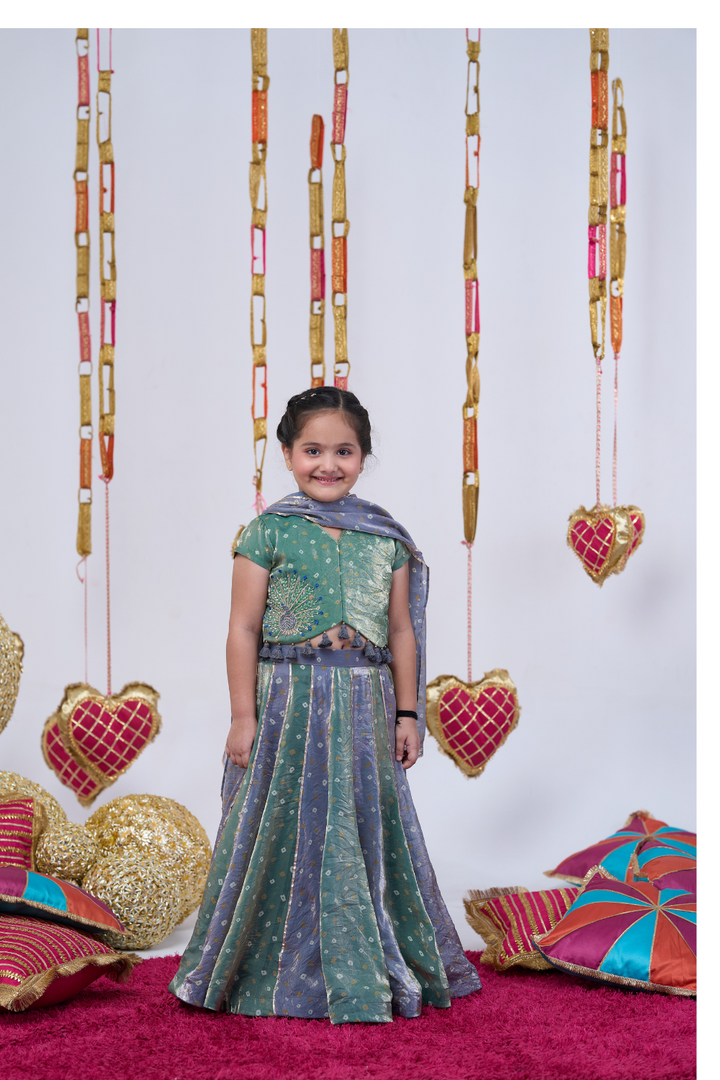Enchant everyone with this Handwork Peacock Lehenga in shimmery Bandhani fabric. Featuring intricate peacock-inspired handwork, this lehenga effortlessly blends traditional artistry with a festive, glamorous appeal. The soft, lightweight fabric ensures all-day comfort and freedom of movement, making it perfect for weddings, festivals, and special occasions. With its sparkling finish and exquisite detailing, this lehenga is designed to make your little girl look graceful, stylish, and picture-perfect.