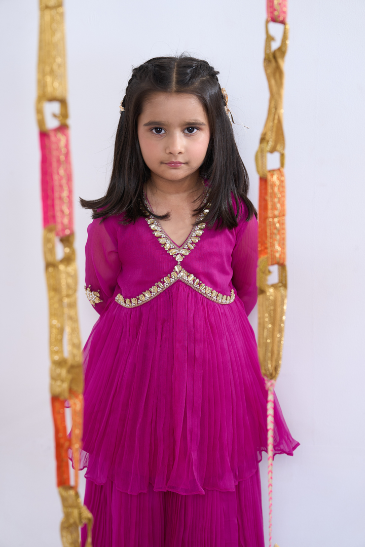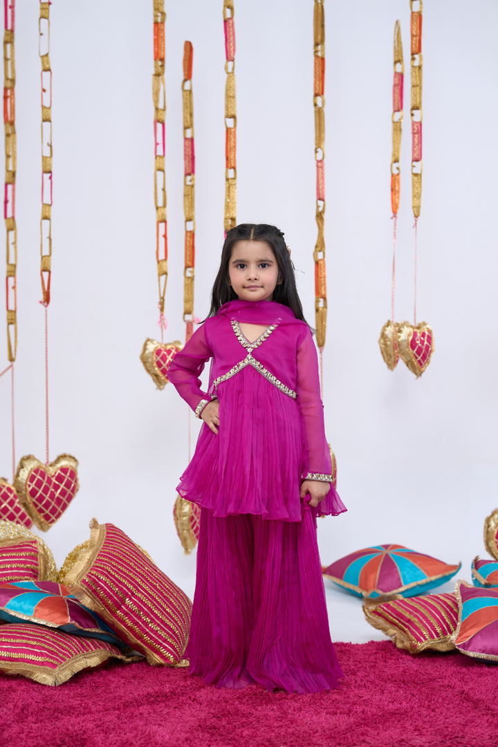 Grace your festive occasions with this stunning Pink Alia-Cut Sharara Set. Crafted from lightweight chiffon fabric, it showcases exquisite full hand embroidery that adds a touch of luxury and elegance. Perfect for weddings, celebrations, and special events, this ensemble beautifully blends traditional charm with contemporary style