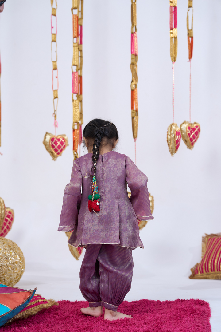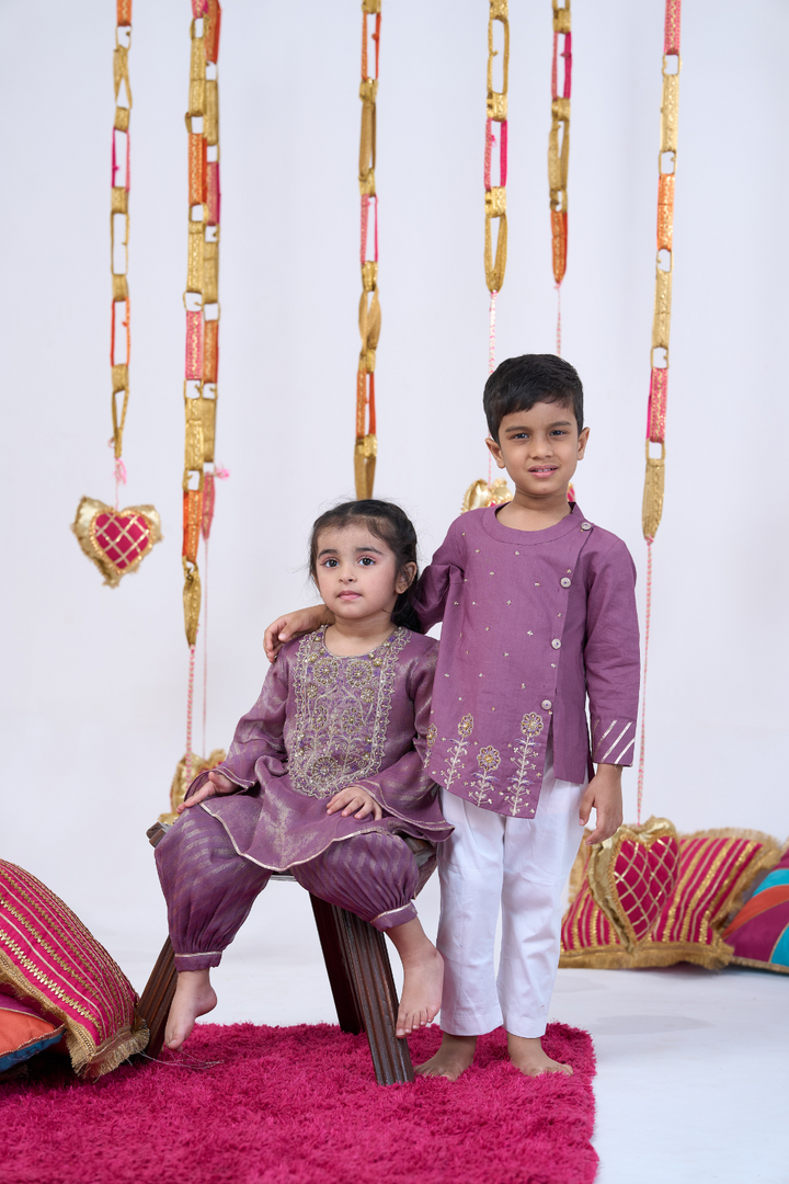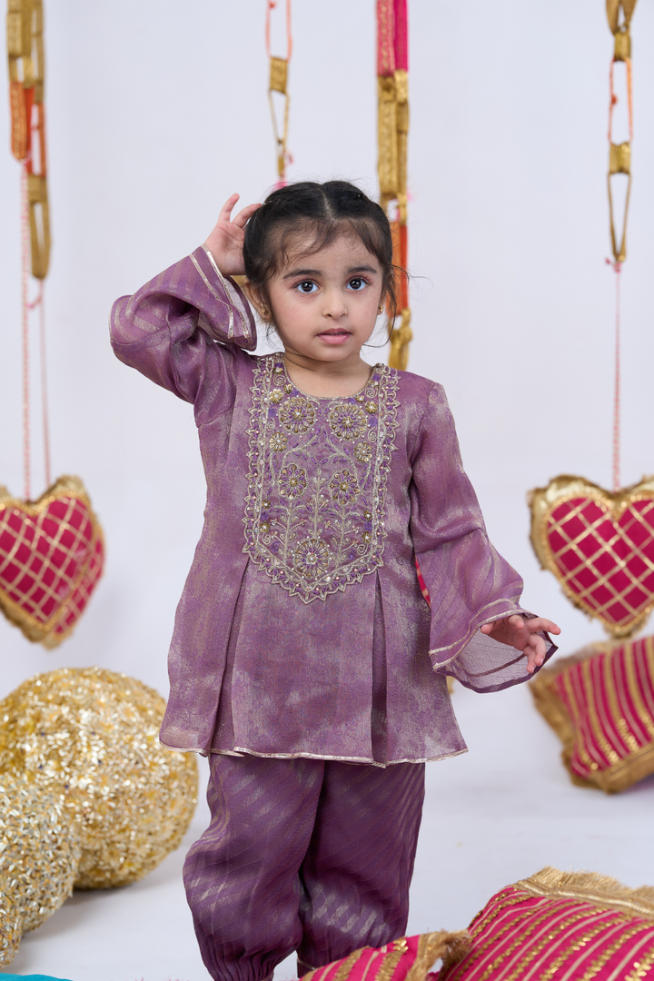 Bring a touch of elegance to your little girl’s festive look with this Purple Handwork Kurta and Balloon Pants Set. Crafted from soft, breathable fabric, it ensures maximum comfort while adding a stylish flair. The intricately done handwork detailing enhances its traditional appeal, making it perfect for weddings, festivals, family gatherings, and special occasions. The trendy balloon pants paired with the elegant kurta create a charming and graceful outfit she’ll love to wear.