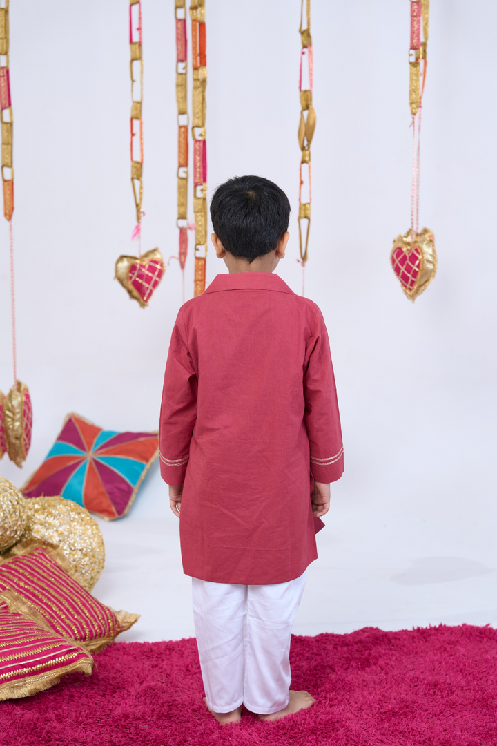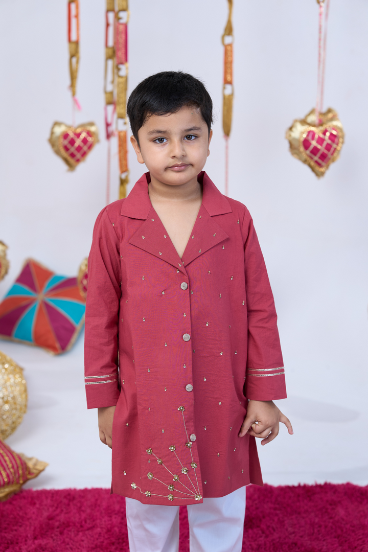 Add a traditional touch to your little one’s wardrobe with this Rust Handwork Kurta Set for boys. Made from soft and breathable cotton fabric, it ensures all-day comfort and ease of movement. The elegant handwork detailing gives it a festive charm, making it an ideal choice for weddings, family functions, festivals, and special occasions. Paired with matching bottoms, this kurta set perfectly blends style, tradition, and comfort.
