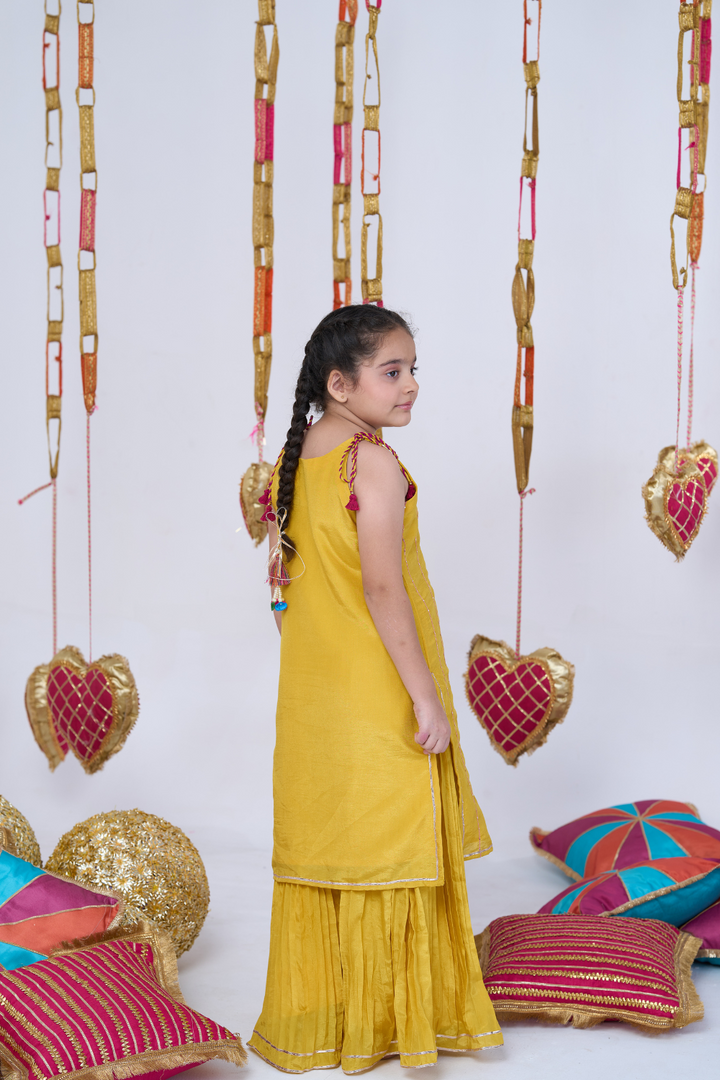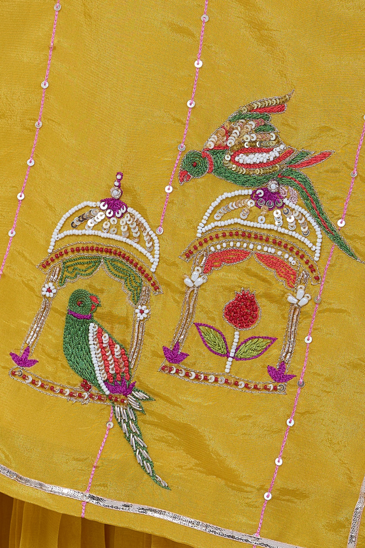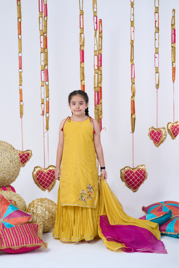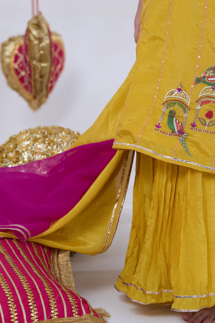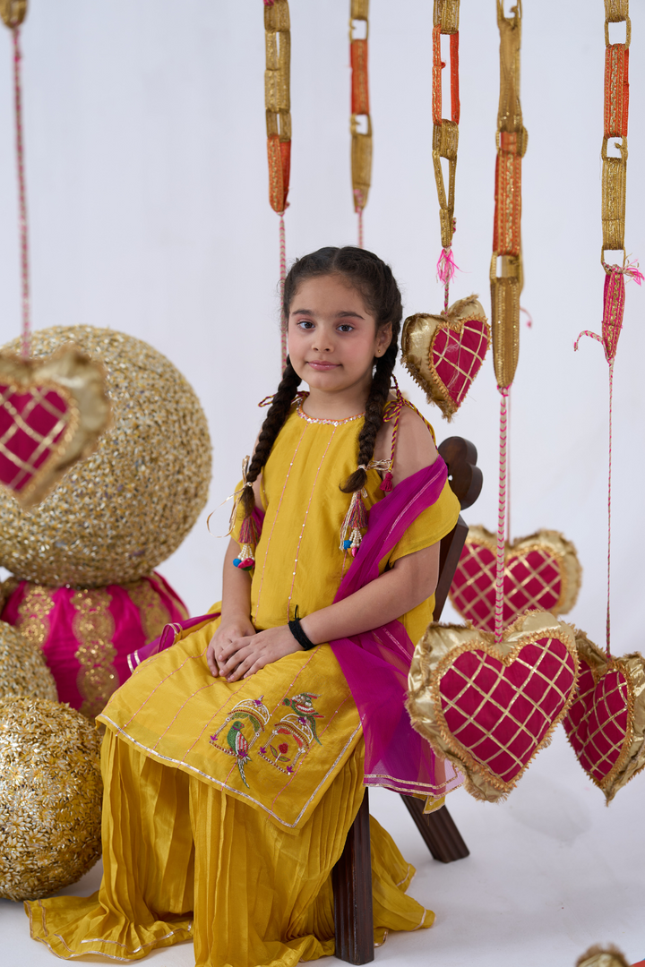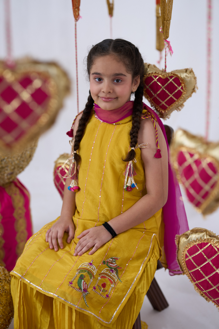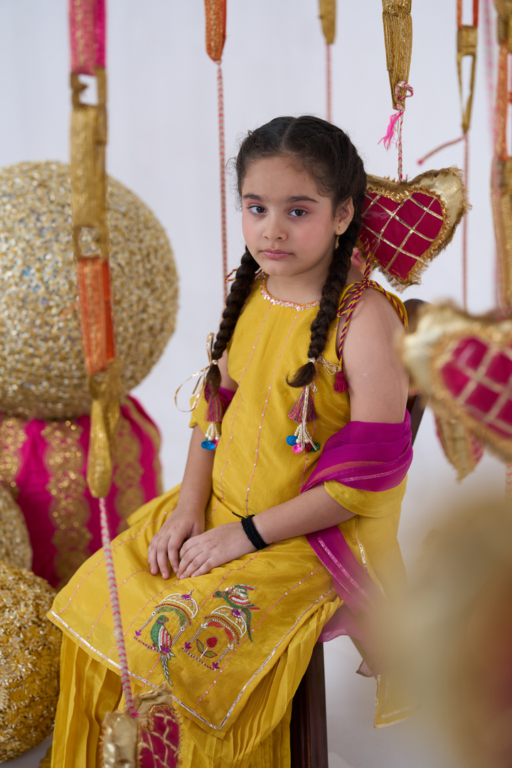 Brighten up celebrations with this Yellow Sharara Set for girls, featuring exquisite parrot embroidery. The elegant kurta paired with flowing sharara pants combines traditional charm with playful style. Lightweight and comfortable, this set is perfect for weddings, festivals, and special occasions, ensuring your little one looks graceful and stands out with every step